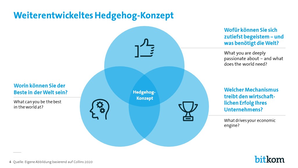 Für die Erarbeitung des Purpose sowie einer überzeugenden Vision für ein Unternehmen kann das Hedgehog-Konzept eingesetzt werden. Zentrale Impulse für die Strategiearbeit liefern die Antworten auf die folgenden drei Fragen: