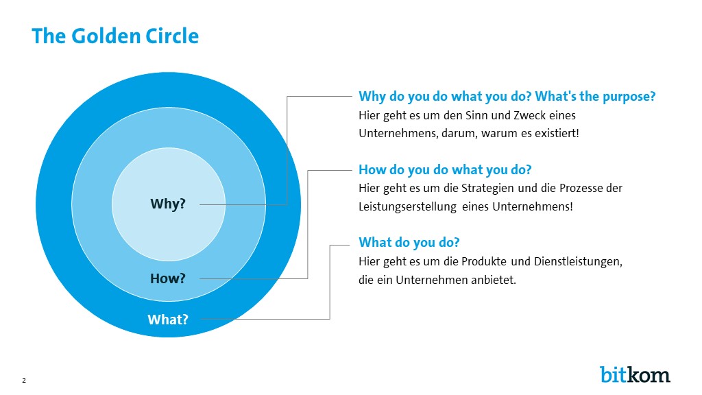 Aus dieser Frage folgt, dass ein Unternehmen in der heutigen Zeit auch eine wertschöpfende Begründung für das unternehmerische Tun mitliefern sollte – konkret einen Collective Purpose. Hierfür hat Sinek den Golden Circle als Management-Tool entwickelt. Es formuliert für die Unternehmensleitung drei zentrale Fragen: